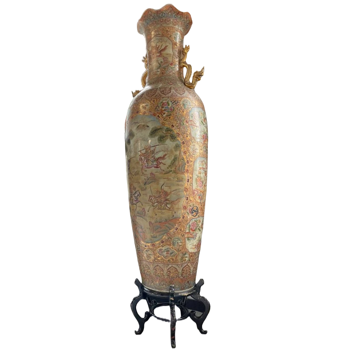 Поки що хочеться звернути увагу на одну абсолютно незаперечну обставину. А саме насправді унікальний розмір цього порцелянового дива. Висота вази – 1 метр 80 сантиметрів. Дивлюся на неї – і уявити не можу, яких розмірів мала бути піч, побудована для випалу цієї вази. Дивлюся на неї – і уявити не можу, скільки часу знадобилося художникам для того, щоб у найдрібніших деталях вручну виписати сцени кінних битв самураїв і пейзажі японських поселень, а також фрагменти яскравих квіткових композицій.
