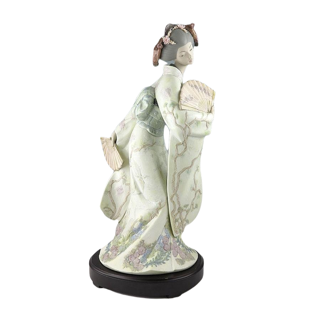 Цю велику (більше півметра заввишки) і надзвичайно ніжну роботу я знайшов випадково, прогулюючись багато років тому Лондоном. Точніше, я її зовсім не шукав. Просто у вітрині одного магазину на Оксфорд-стріт побачив гарний порцеляновий посуд і вирішив ближче розглянути його. Розглянувши, збирався вже йти, аж раптом на одній із полиць помітив цю прекрасну постать японської жінки. Повірте, в цій роботі чудово все - і тонкі квіти, які прикрашають зачіску героїні композиції, і дивовижна природність пози молодого жіночого тіла, і оздоблення, яке рясніє безліччю рельєфних візерунків, що символізують традиційне поєднання великих японських квітів. Встояти перед такою красою я, звісно, ??не міг.
